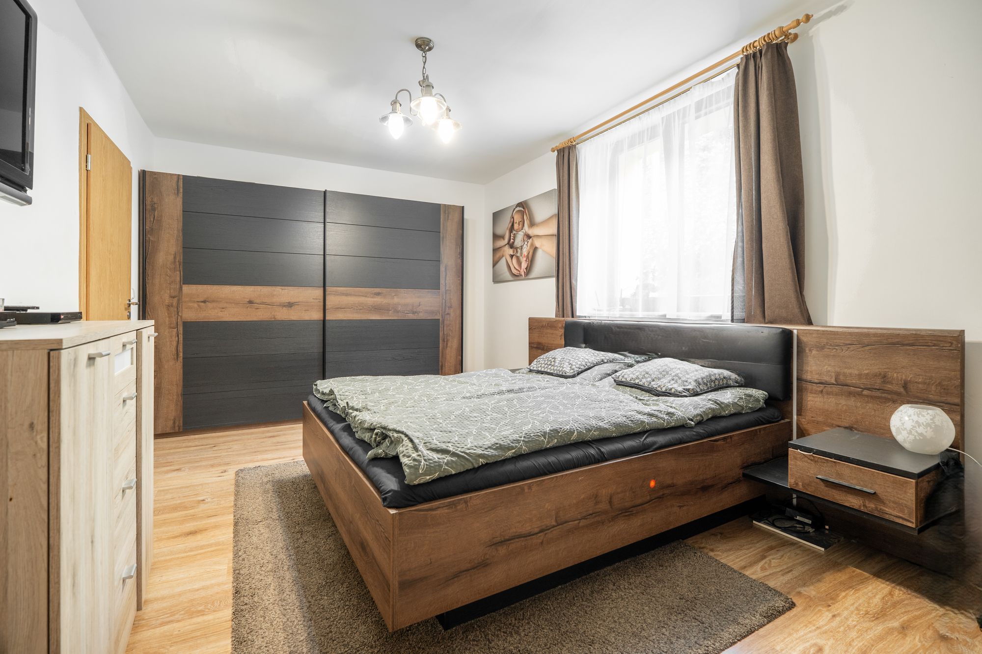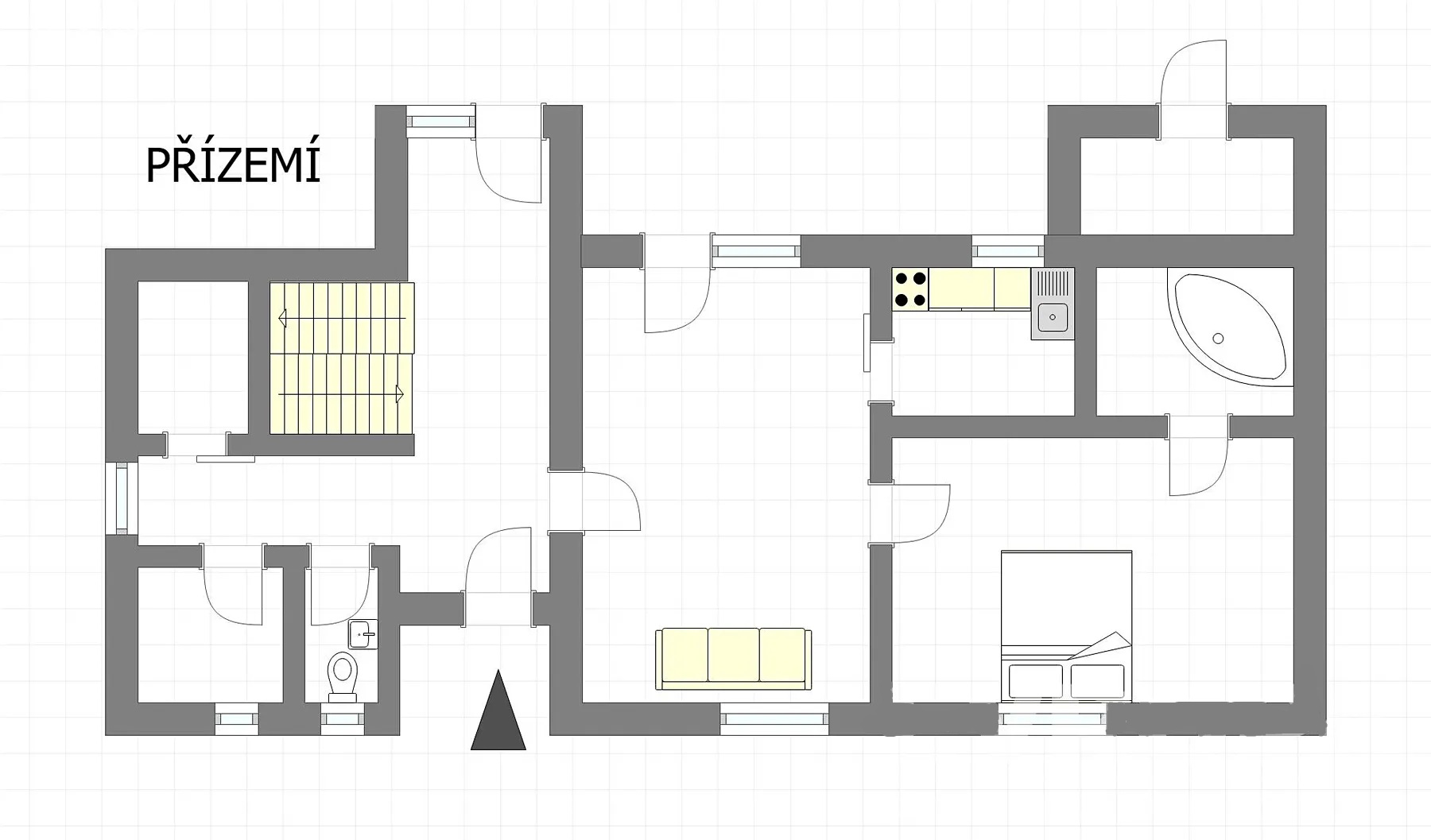 - Sklep: cca 4–5 m² (nízký strop, technické zázemí + skladování)